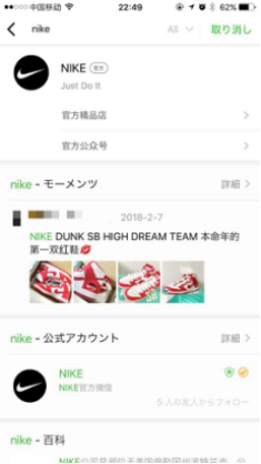 值得一提的是,当用户搜索品牌关键词时,出现的不仅有该品牌的官方精品店,还能看到朋友圈内所有好友关于该品牌的投稿,以及该品牌公众号、百度百科等内容。