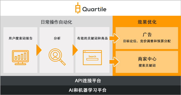 此外,“Quartile”平台采用AI、机器学习和相应的算法,能够无缝连接到Amazon广告API(*)的广告相关数据,通过运用“以AI和机器学习优化广告的(目标定位、竞价调整和预算分配)”、进行“搜索关键字的报告、分析和设置”,使供应商和商家