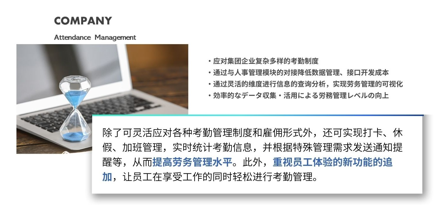无论是中国企业独特的人事管理制度,各省市的五险一金、个税等,还是日本大型集团企业特有的驻在员管理、出向管理、兼务管理、集团内转籍、与总公司的信息联动,特别是海运行业所需的船员特殊班次管理、建设业的项目管理、金融业人事管理(亲属关系限制)等,都可以通过COMPANY的标准功能实现灵活应对。