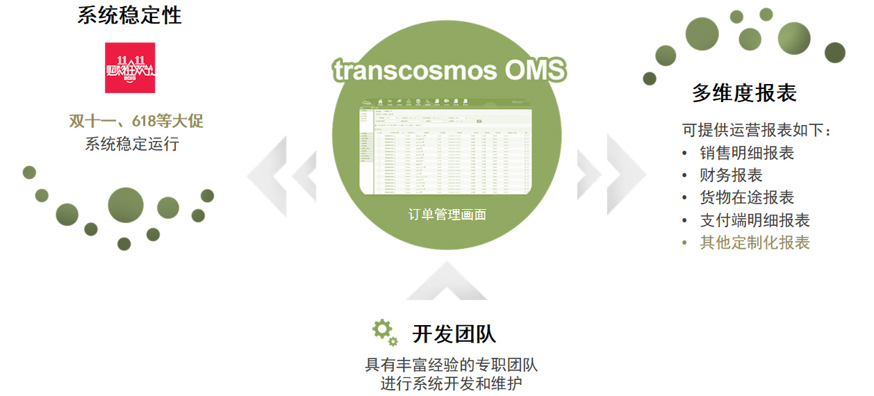 transcosmos自主开发的OMS系统,能够快速处理各类订单、清晰展现物流仓储信息,并自动生成各类报表,具有系统稳定及可二次开发等特点,即使在618、双11等大促期间也能轻松应对。