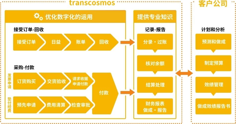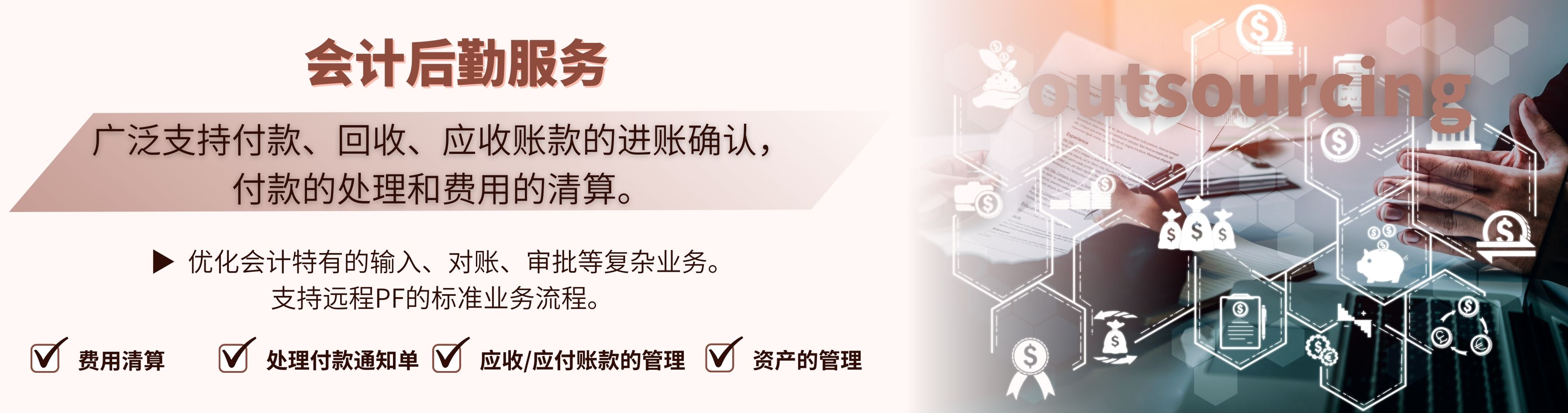 所谓的会计后勤服务就是不仅提供日常发生的输入、对账、分录,应收账款、应付账款的管理等业务,还支持财务报表的做成等广泛的财务外包服务。