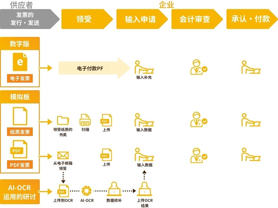 通过结合发票管理系统和BPO服务,我们可以通过提供纸质版、PDF版、电子版等付款通知单原件(可以是模拟的或者数字版的)进行付款的申请、确认、审批和付款清算等一系列业务。
