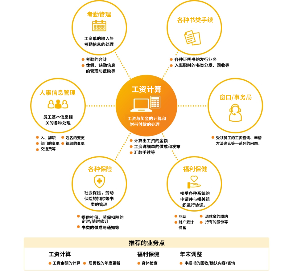 人事后勤服务是以员工的工资计算业务为中心,提供从人事信息管理到员工咨询窗口,更甚与是社会保障律师和税务会计师合作的专业操作的一站式外包服务。