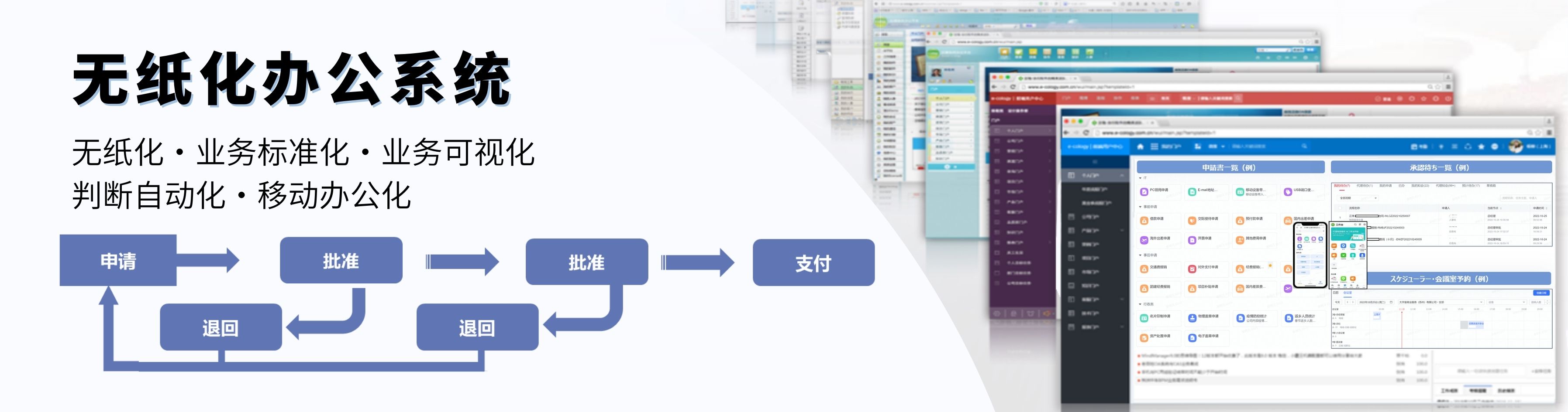 ➤将申请和审批之类的业务,通过统一和可视化应用,提高操作效率,并通过去除无效管理来提高内部管理质量。