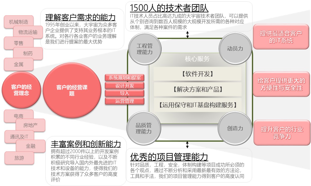 大宇宙IT信息技术集团由大宇宙信息创造(中国)有限公司,苏州大宇宙信息创造有限公司,济南大宇宙信息创造有限公司,深圳大宇宙信息创造有限公司以及大宇宙日本株式会社组成。总公司设在天津,在沈阳,济南,苏州,广州,深圳和日本东京设有分支机构