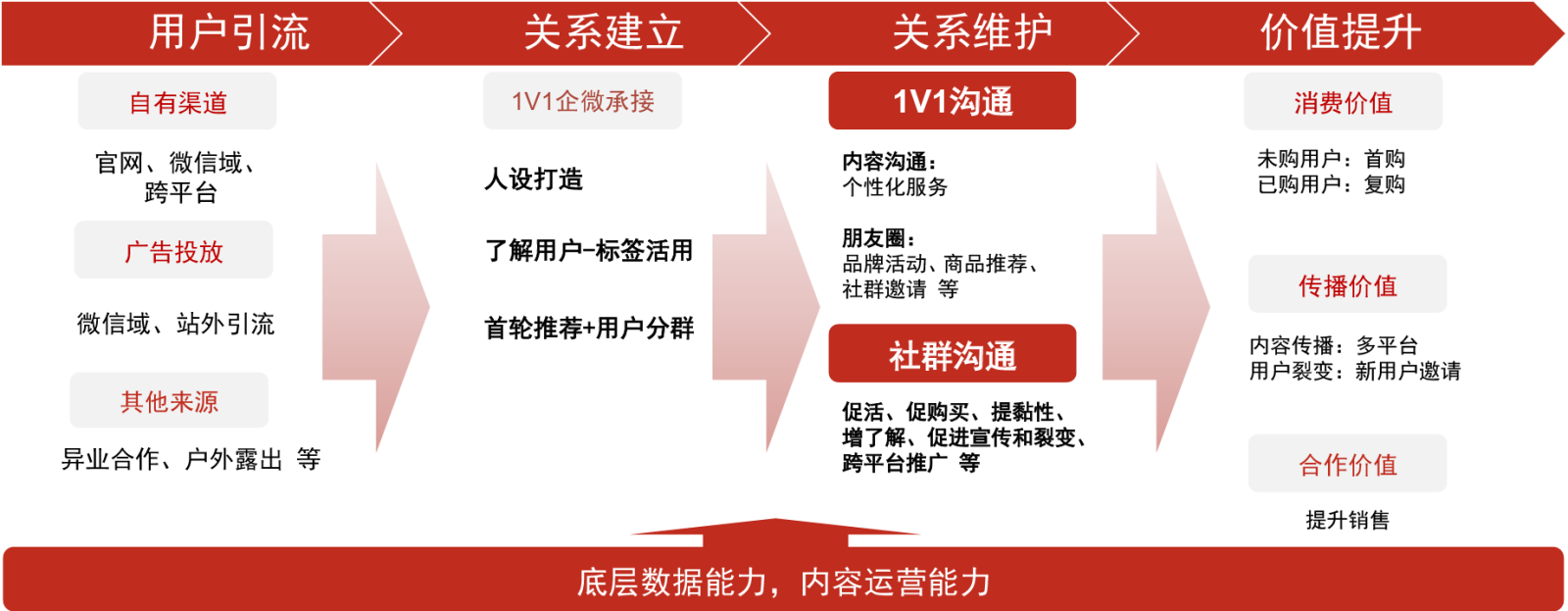 通过多平台的引流将更多顾客沉淀到企微,在企微根据品牌特性,进行1V1及社群运营,提升顾客的多重价值。