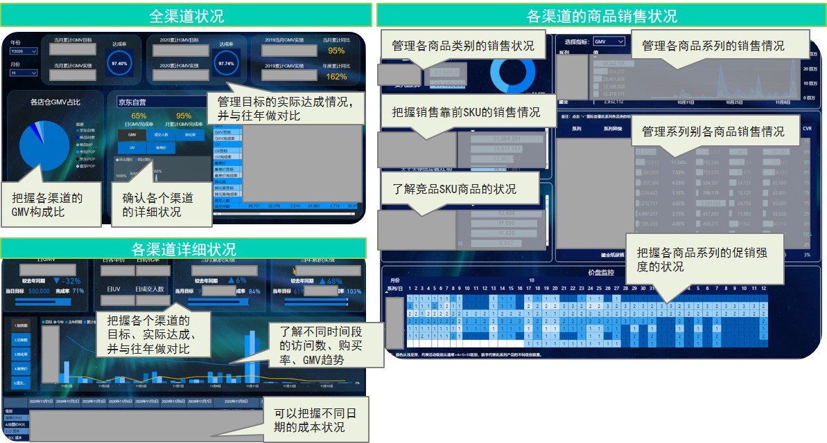 如图所示:通过BI工具实现全渠道和各渠道的销售数据可视化,包含“销售额情况”、“销售商品构成”、“折扣情况”、“竞品销售情况”等信息。