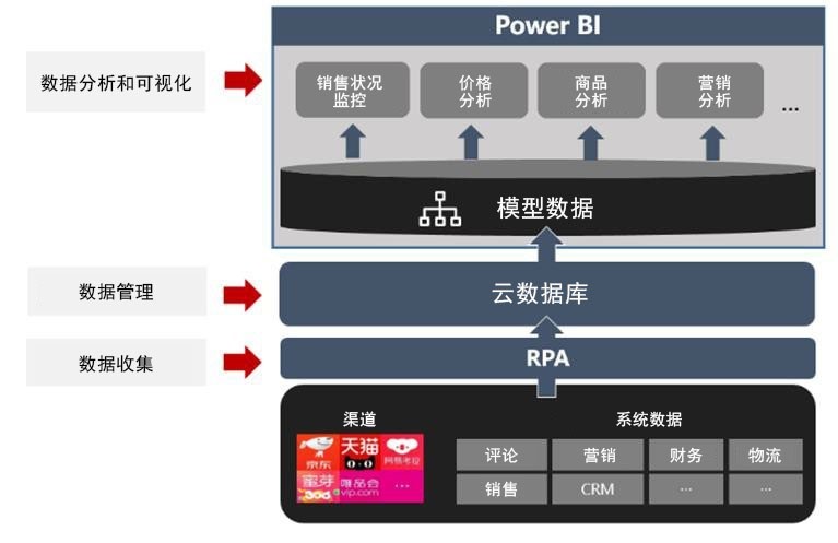 transcosmos凭借丰富的电子商务运营和数据分析经验,针对品牌方的痛点,通过三个阶段为企业客户实现数据的整合和可视化:第一阶段,采用机器人流程自动化(RPA)程序自动收集CRM、营销和物流等数据;第二阶段,使用可扩展的云端数据库存储并管理数据;第三阶段,通过Power BI,搭建各类不同的仪表板,实现数据可视化。企业不仅可以随时查看所有店铺的销售情况、KPI的达成情况,并且可以快速诊断哪些渠道表现不佳及问题所在。