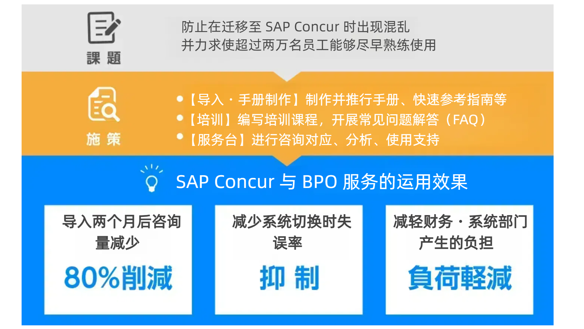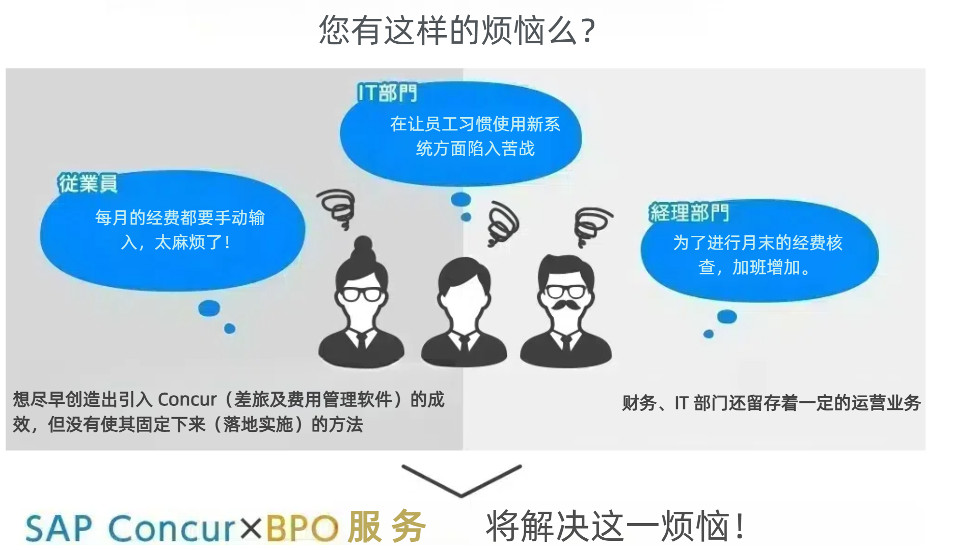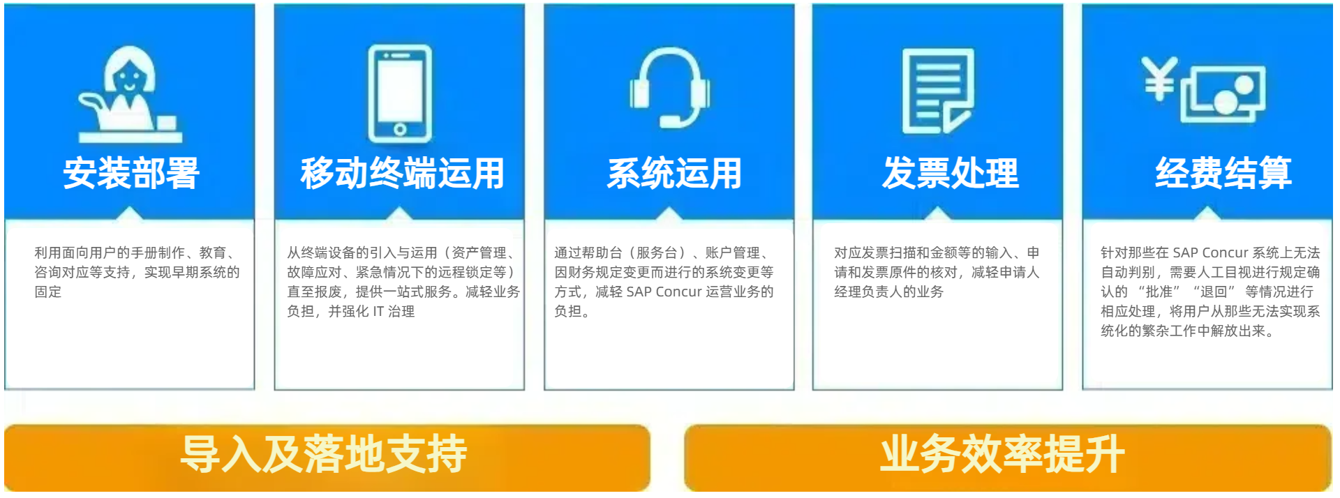 从(SAP)Concur 系统引入及落地的全方位支持服务开始,与经费处理相关的所有业务都可以进行完全外包